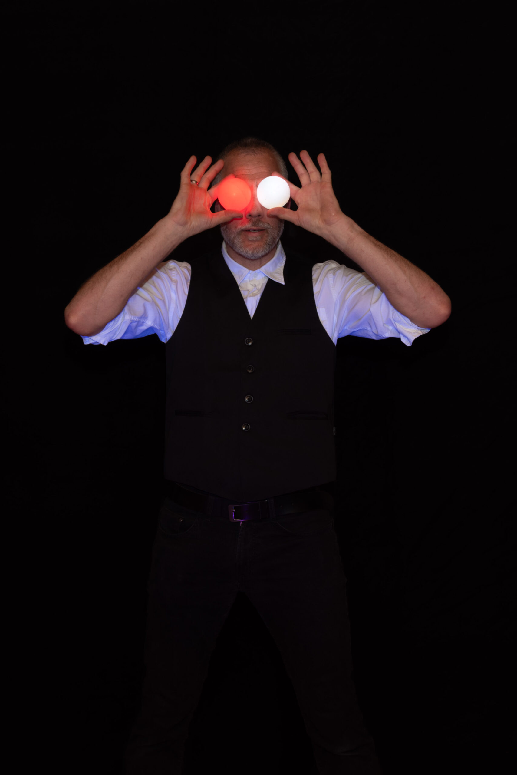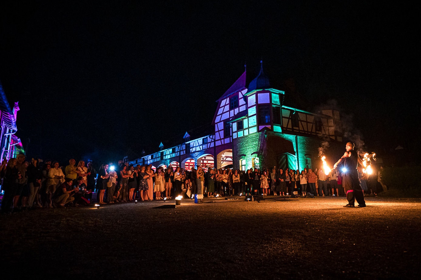 Ein einfacher Stromanschluss im Umkreis von etwa 50m ist ausreichend. Sollte einmal kein Strom in der Nähe sein, kann ich dank leistungsstarker Akkutechnik auch unabhängig von einem Stromanschluss spielen. Selbst die professionellen Flammenprojektoren laufen über Akku, so dass ich auch bei größeren Shows flexibel in der Wahl der Spielfläche bin. (Einzig die Nebelmaschine und bei Großveranstaltungen meine große Tonanlage läuft leider noch nicht über Akku ;-)) Für die Show sollte es der besseren Wirkung wegen möglichst dunkel sein. Als Profi, der auf die visuelle Wirkung bedacht ist, achte ich soweit möglich auch auf den „Bühnenhintergrund“. Denn spätestens bei den Erinnerungsfotos machen sich auch solche „Kleinigkeiten“ deutlich bemerkbar 🙂